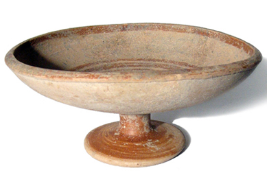 Nice Daunian pedestal bowl, Italic-Greek, early 3rd Century BC. Well-thrown and decorated with concentric circles in red-brown slip. H: 2 3/4" 6.9 cm); Dia: 6 1/2" (16.5 cm). Intact with two holes on the edge of the rim for suspension and light earthen deposits. Ex San Diego private collection. #GBA12194: $499 SOLD