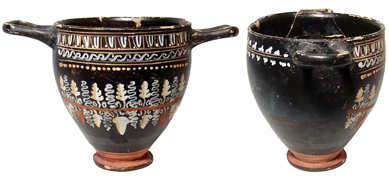 Ancient Greece. Magnia Graecia, 4th Century BC. A large and attractive Apulian Skyphos, with vine motif below bands containing an egg pattern, curved lines and pellets, the opposite side with somewhat stylized vine motif. H: 4 3/8" (11.1 cm). Area of repair on backside, some wear of the glaze in a few spots. Absolutely gorgeous. Ex Orange County private collection. #A14153: $699 SOLD