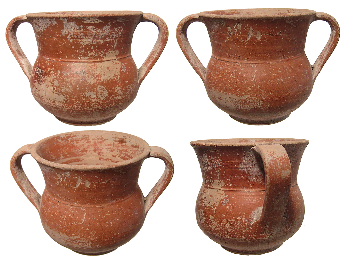 Ancient Greek, c. 4th-3rd century BC. Gorgeous terracotta drinking cup. With shallow bowl with single loop handle, decorated with bands of red-orange slip around the inside and outside. Great color with light mineral deposits. L: 4 3/16"; H: 1 1/4". Ex-collection of Howard Sirak, Columbus, Ohio. #AG2164: $399 SOLD