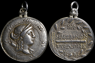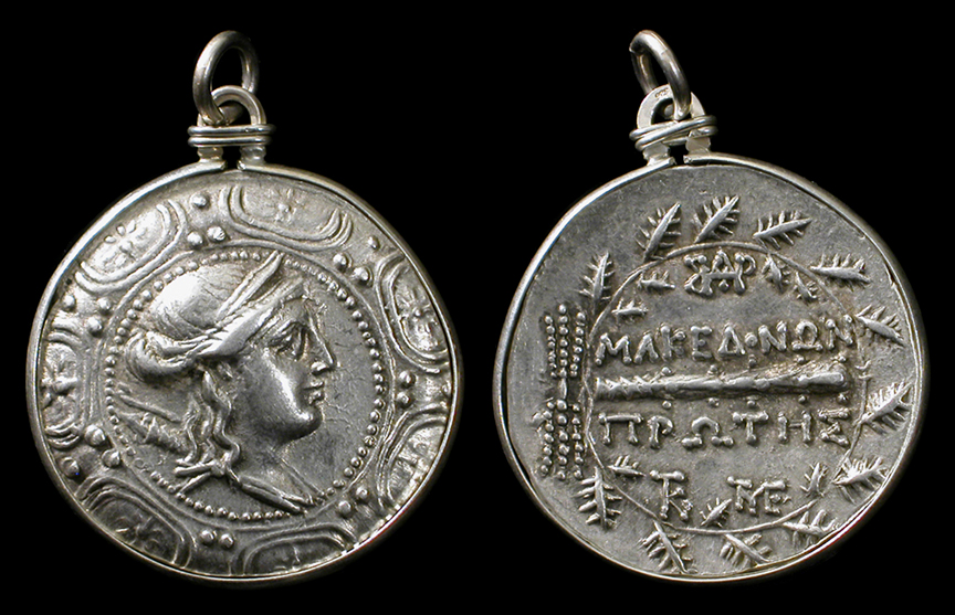 Ancient Greece. Macedon, 158 - 149 BC. Silver tetradrachm, struck under Roman occupation. Set into custom 14K gold bezel. Diademed head of Artemis with quiver over shoulder, in the center of a Macedonian shield / MAKEDONWN PRWTHS, club of Herakles within oak wreath; AP monogram above. Coin 29 mm, 16.82 g, Choice Extremely Fine with lovely patina. ref: SNG Ash. 3290. Entire piece 48 mm (1 7/8") including loop, weighs 31.80 g. Coin ex-Los Angeles, CA collection. High-quality and magnificent. his photo does absolutely no justice! #CG2135: $2500 SOLD