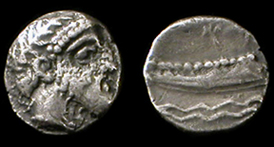 Silver 1/8th shekel. Ship with warriors & shields, sea monster swimming below / Lion attacking bull, Phoenician inscription. Scarce and mint state! ref: sear 6010. 12 mm, 0.8 grams. #893: $125 SOLD