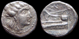 Phoenicia, Arados. c. 3rd Century BC. Silver Hemidrachm. Head of Tyche right, wearing turreted crown; border of dots / Prow of galley left; monogram above. ref: BMC 87. 12 mm, 1.87 g. #CG2096: $150 SOLD
