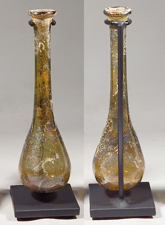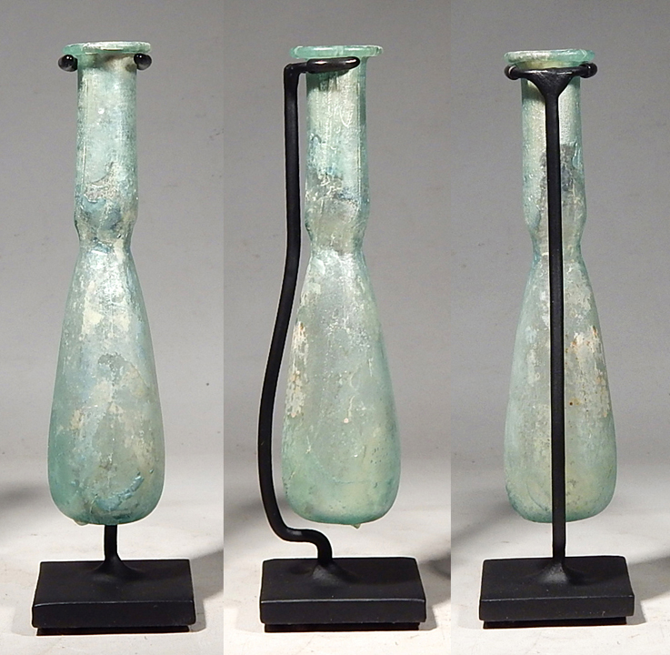 Holy Land, Roman period, c. 1st Century AD. Lovely light green glass "tear vial" bottle. With an ovoid body, tall neck, and uneven rim. A light coat of ancient dirt on interior and exterior. lovely iridescence on the exposed areas. 3 1/4" (80 mm). Ex South Yorkshire, England private collection. Mounted on nice custom stand. #GL2008: $399 SOLD