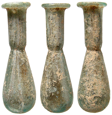 Biblical Judaea. Holy Land, Roman period, c. 1st-2nd century AD. Nice light blue-green glass "tear vial" bottle with light iridescence and some earthen deposits. H: 4" (10.2 cm). Intact. Ex Royal Athena Galleries, New York. #GL2001: $325 SOLD