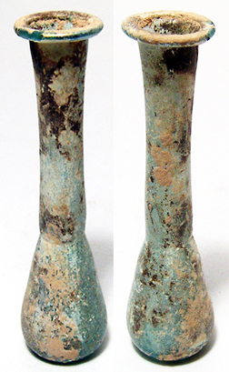Holy Land. Roman period, 1st – 2nd Century AD. A lovely glass "tear vial" bottle. A blue-green glass unguentarium, the piriform body with rounded base, long cylindrical neck with constricted base, the mouth flared with inward folded rim. Nice blue-green color with heavy earthen deposits. H: 8 cm (3 1/4"). ex-Brauns collection, Santa Monica, CA, part of a collection purchased from old dealers in Israel in the 70's and 80's. #GL2049: $399 SOLD
