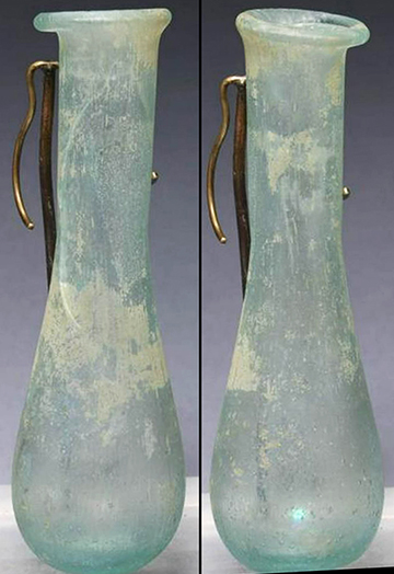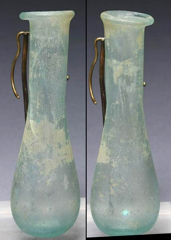 Biblical Judaea. 1st century BC - 1st century AD. Glass "tear vial." Lovely irridescent sandy egshell patina, delicate, graceful curves and twisted spout. Small hairline fracture on one side. Measures 78 mm. #2610: $135 SOLD