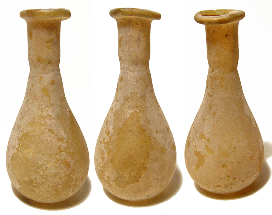 Holy Land. Roman period, 1st – 2nd Century AD. A lovely tall glass "tear vial" bottle. A yellow glass unguentarium, the piriform body with flattened base, long cylindrical neck with constricted base, the mouth flared with inward folded rim. Nice pale yellow color with light deposits. H: 5" (12.8 cm). Ex Seattle, WA private collection. #GL2037: $299 SOLD