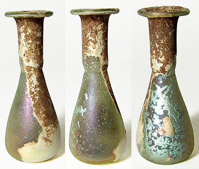 Biblical Judaea, c. 1st century BC / 1st century AD. Tall glass tear-vial. Lovely irridescent patina. Delicate, tapering form. Completely intact! Stands 122 mm (4 3/4") tall! Great display piece. #5764: $325 SOLD