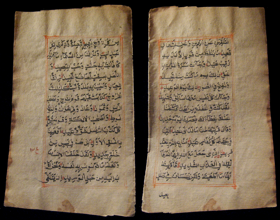 Very large and early Ottoman Koran (Quran) manuscript leaf dating from 1104 AH (1692 AD). It is written with bold Arabic letters in black ink with red accents. Foxing, ink blotches, and some dirt, but the text is not seriously affected. The borders exhibit some damage as well. This is 1 leaf (front and back). Measures 11 1/4” x 7 1/2”. #AA2009: $175 SOLD