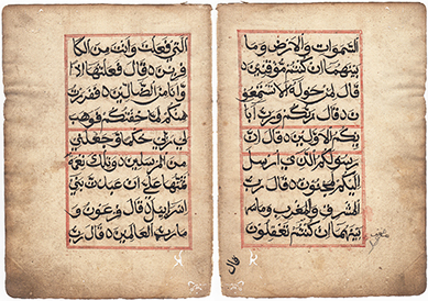 Illuminated pages, still bound together. From a handwritten Ottoman-era Koran dated 1277 AH / 1860 AD.