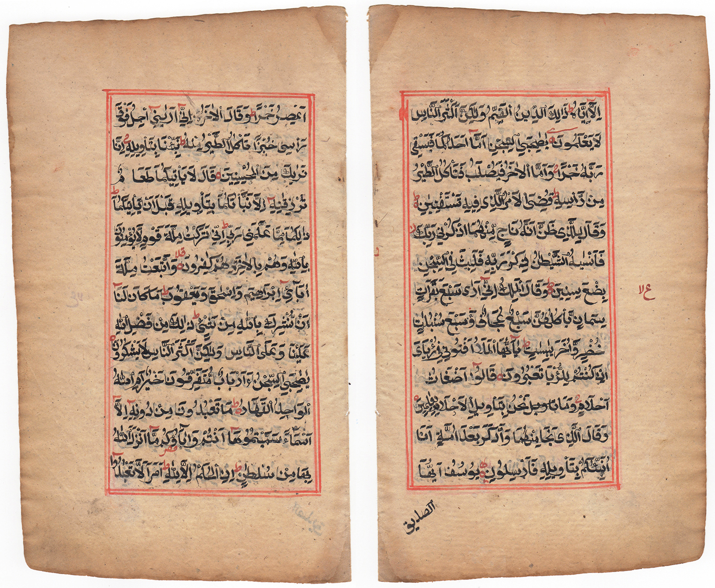 Beautiful Ottoman-period Koran (Quran) manuscript leaf, c. 1700-1800 AD. The text represents verses from Sura Al-Shuara' (The Poets), and is written in beautiful Arabic calligraphy with black ink with red accents, the verses framed within a red frame. Dark areas around edges. This is 1 leaf (front and back).