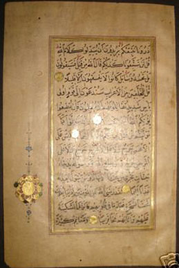 Illuminated manuscript pages found with a group of handwritten Islamic Koran. Some have Illuminated multicolored floral marginal medallions, Naskhi script in black ink within a 24K gold frame with gold discs between the verses. Vowels and diacritical signs are in black & red. Some marginal tears consistant with age and use. Otherwise in good antiquariat condition. Date not on this leaf but in another section of the manuscript.