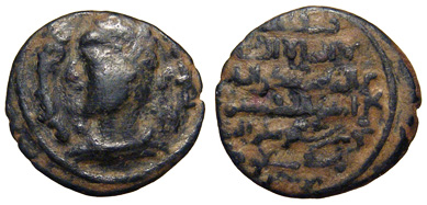 Bronze 29 mm dirhem of 560 A.H. obv: Bust of ruler 1/4 left.