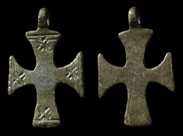 Bronze cross pendant. Decorated with punched-dot "Five Wounds of Christ" design. 40 mm (1 1/2"), robust suspension loop. Olive-green patina, earthen deposits. ex-German private collection. #JM2101: $225 SOLD
