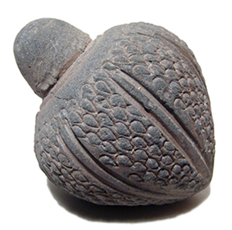 Time of the Crusades, Holy Land, c. 6th - 9th Century AD. Choice very large Islamic-period grey ware hand grenade! The body with stylized bands with what resembles seeds from a pomegranate, parallel grooves between each. Domed top with opening for flammable liquid and wick. H: 5 1/8" (13 cm). Intact , minor age crack. A beautiful example! Ex Orange County private collection. #A15176x2: $799 SOLD