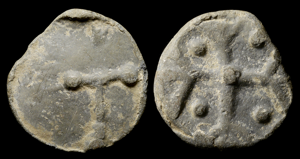 Medieval/Crusader England, c. 13th-14th century AD. Great lead seal depicting two crosses! One side with the True Cross upon a base, the other with a Crusader cross with four pellets. 23 mm diameter. Grey patina, light earthen deposits. A very cool piece. Found in East Kent, England. #AM2086: $225 SOLD