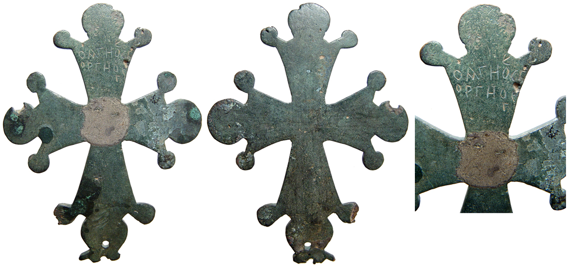 Massive Byzantine bronze ceremonial cross with inscription, c. 10th - 12th Century AD. The arms flaring out, each ending in three circular projections or roundels, the middle roundel larger than the two on either side. On the top arm is the name of St. George and the remains of an attachment at the center of the cross indicated there was more than likely an image of this saint. A hole for attachment to a pole or mount at bottom. H: 5 3/8" (13.7 cm). Great green patina with a few pits and two of the smaller knobs with minor damage. Ex Los Angeles private collection. This sort of cross was placed in the sanctuary, behind the altar, or in other parts of the church, and when it was used during services it was probably attached to a pole. Nice! #A13150x2: $650 SOLD