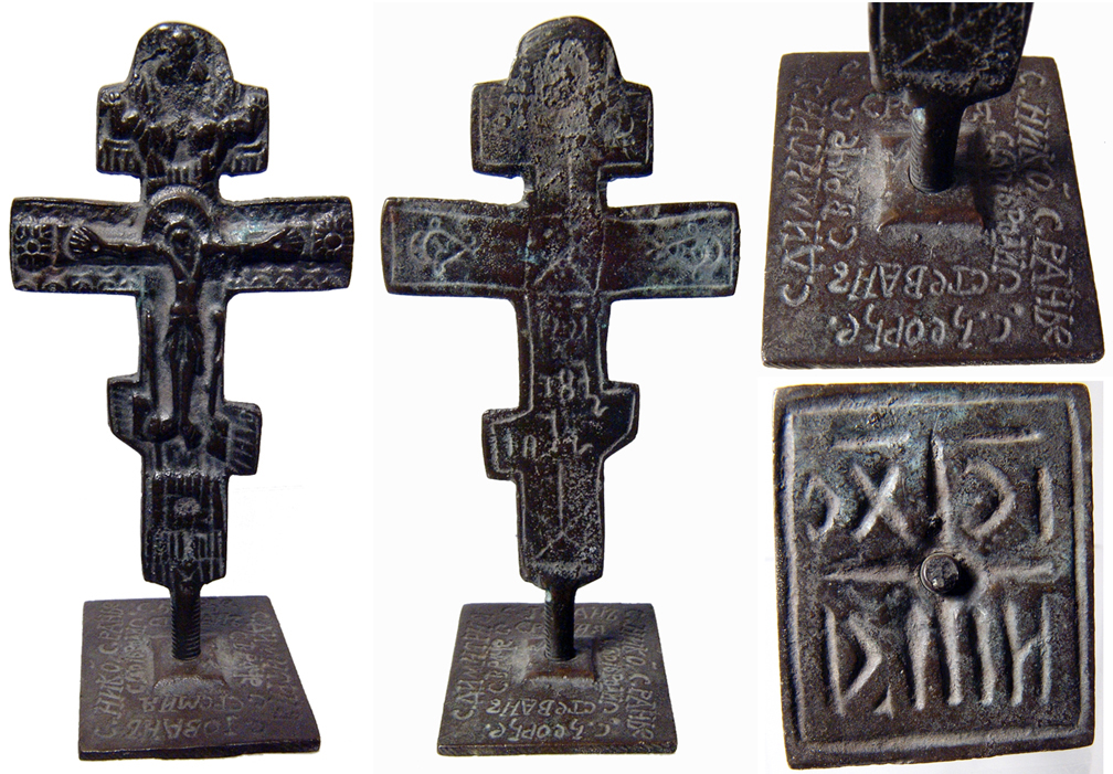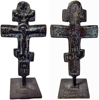 Bronze cross, dated 1812 AD. Exquisite Latin cross design. Likely a ceremonial Easter bread stamp. Crucifix design, with Jesus Christ upon the cross, archangels with trumpets above. Great hand-etched designs on the back, including the date "1812". Stands 100 mm (4 inches) tall. Chocolate-brown to olive green patina. An interesting and beautiful display piece... stands on its own. #90911: $375 SOLD