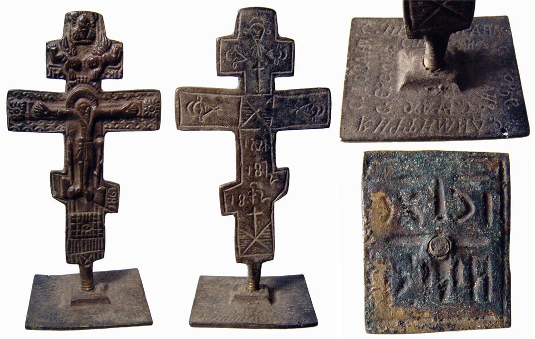Bronze cross, dated 1812 AD. Exquisite Latin cross design. Likely a ceremonial Easter bread stamp. Crucifix design, with Jesus Christ upon the cross, archangels with trumpets above. Great hand-etched designs on the back, including the date "1812". Stands 103 mm (4") tall. Deep olive-green to chocolate-brown patina, not well represented in these washed-out photos. The best of the group! #18406: $375 SOLD
