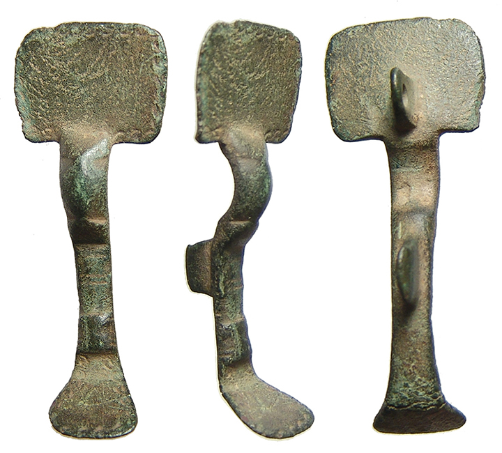Anglo-Saxon England, c. 8th-9th century AD. Bronze fastener. Looped end slightly raised, the opposing loop apparently broken off in antiquity. Nice patina. 42 mm (1 5/8") and heavy. ex-Timeline Galleries, UK. #AM2011: $85 SOLD