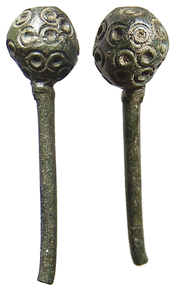 Anglo-Saxon England, c. 900-1000 AD. Bronze pin head found in Norfolk. Likely from Tetley, Lincolnshire, deposited ca. 970. Purchased from Astarte Gallery, 1988. L: 34 mm, with excellent green patina. ex-Dr. Robert D. Fulk, IN. #AM2186: $175 SOLD