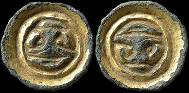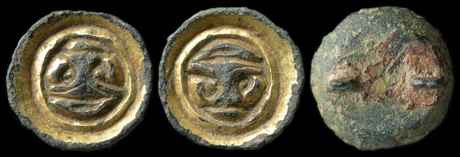 Anglo-Saxon Britain, c. 6th century AD. Excellent gilt bronze button brooch in the form of a stylized face! When rotated another face appears. W: 18 mm (11/16"). ex-Dr. Robert D. Fulk, IN, purchased from C. J. Martin, 1993 #AM2200: $425 SOLD