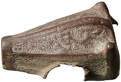 Anglo-Saxon England, c. 8th-9th century AD. Bronze strap end with mouse-head point. Single rivet hole, wide space between where the leather strap would have been, point decorated with a mouse's head with triangular ears and pointed nose. Top with simple detail. Dark grey patina. 29 mm (1 1/8") long. ex-Timeline Galleries, UK. #AM2003: $55 SOLD