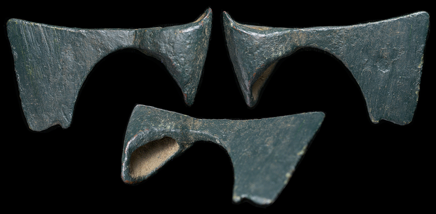 Anglo-Saxon England, c. 8th-9th century AD. Bronze armor fitting or dagger chape. Large central hole, smapp holes in the 2 rounded terminals. 49 mm (1 15/16") long, grey patina. #AM2012: $85 SOLD