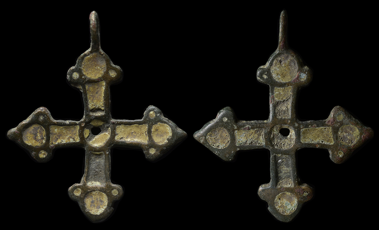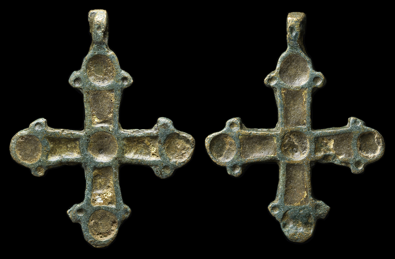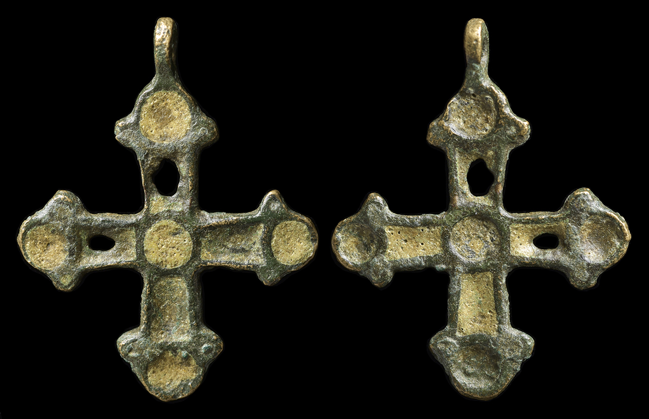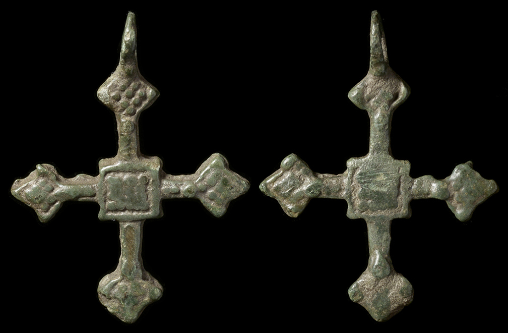Viking Europe, c. 10th-11th century AD. Small bronze cross pendant. Both sides decorated with a central medallion with a square dotted design, raised dotted designs on the 4 diamond-shaped terminals. Suspension loop intact. Olive-green patina. H: 27 mm (1 1/16"). ex-London, UK gallery. #JM2280: $250 SOLD