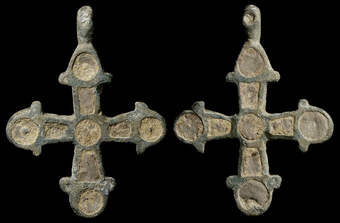 Nice bronze cross, both sides decorated with yellow and white paste inlays (now toned gray). The metal has a dark olive-green patina and much of the original inlays remain! Light earthen deposits. 40x32 mm (1 5/8" x 1 1/4"), suspension loop intact. ex-London, UK gallery. #JM2408: $350 SOLD