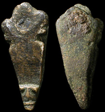 Anglo-Saxon England, c. 8th-9th century AD. Bronze strap or "tag" end. Incised with an eerie, stylized facing head. Niello inlay still evident in crevices. 30 mm (1 1/8"). #AM2007: $125 SOLD