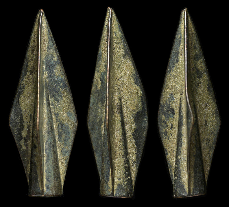 Ancient Egypt. Dynasty XXVII (Persian) Dynasty, c. 525-404 BC. Fantastic bronze arrowhead. Triangular head with long tang and protruding barbs. L: 61 mm (2 7/16"). Olive-green patina with earthen deposits, chip to one barb. Achaemenid-made but used in the Holy Land and Egypt! ref: Petrie 96; Malloy "Weapons" plate XIV, #108. #WP2436: $250 SOLD