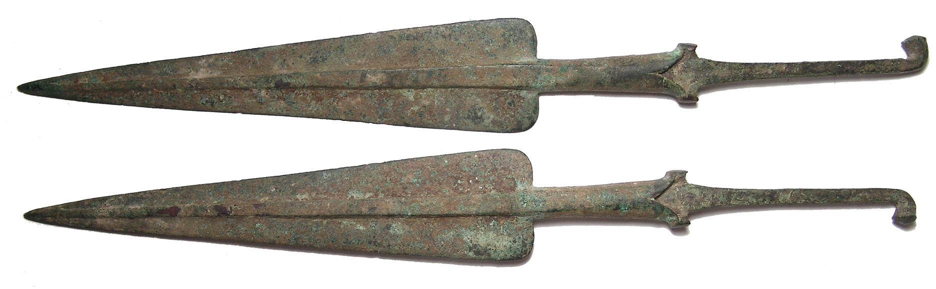 Luristan, Persia, c. 1200 - 800 BC. Large bronze spearhead. Long, triangular blade with wide raised mid-rib and 'rat-tail' tang where it would have been affixed to the spear shaft. Intact with deep olive-green patina and heavy earthen deposits. Huge 33.4 cm (13 1/4") long and heavy! ex-Santa Barbara County, CA scholastic collection. #WP2599: $450 SOLD