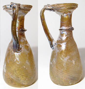 Ancient Roman, 2nd - 3rd Century AD. Great mold-blown green glass single-handle juglet. Nice texture overall, lovely blue-green iridescent color. Light earthen deposits. Repaired. H: 4 3/8" (11 cm). Great color! ex-West Palm Beach, FL collection. #GL2041: $175 SOLD