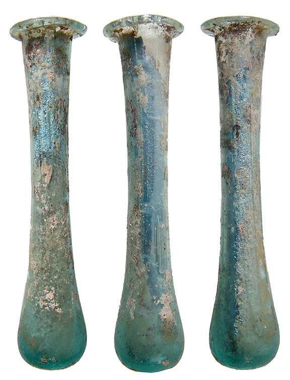 Roman Gaul (France), 1st - 3rd Century AD. Excellent light blue-green glass bottle. Used for cosmetics or medicine which was accessed with an applicator. Stands 10 cm (3 7/8") tall. A 4 cm long area of surface loss on one side of neck, otherwise intact with attractive iridescence. Ex-19th century French collection, found in France in the 1880's. #AR2096: $325 SOLD