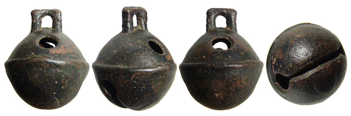 Medieval England, c. 16th-17th century AD. Great bronze bell. Still rings! Damaged in antiquity but still retains its iron "ringer" ball. neat swirling designs on body, with thick, robust suspension loop. Dark olive-green to reddish patina. H: 4 cm (1 5/8").