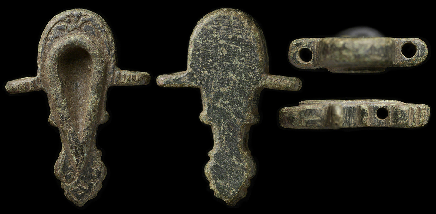 Ancient Rome, c. 1st-3rd century AD. A fantastic and rare Roman bronze "palm thimble." Most commonly used by sailmakers and leather workers. It was tied around the hand and tucked into the palm, and used by setting the eye end of a needle against the recessed end, and pushing the needle using the entire arm. This allowed the sewer to use a great amount of force without hurting the hand while pushing a thick needle through tough materials like leather, canvas or sail cloth. L: 43mm (1 5/8"), intricate incised details. Olive-green patina, light earthen deposits. Ex-Los Angeles, CA private collection. #AR2949: $299