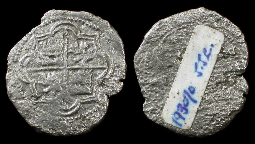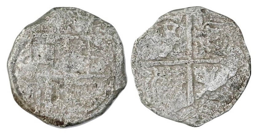 From the wreck of the Atocha. Excellent silver 2-reale "cob" struck under Philip III, Potosi, Bolivia. Grade 1! Cross with castles and lions in quadrants / Shield with Spanish royal coat of arms. Mel Fisher ID number 85A-216391. 26mm, 6.55 g. Rare grade 1 in this denomination! #CS2835: $2500 SOLD