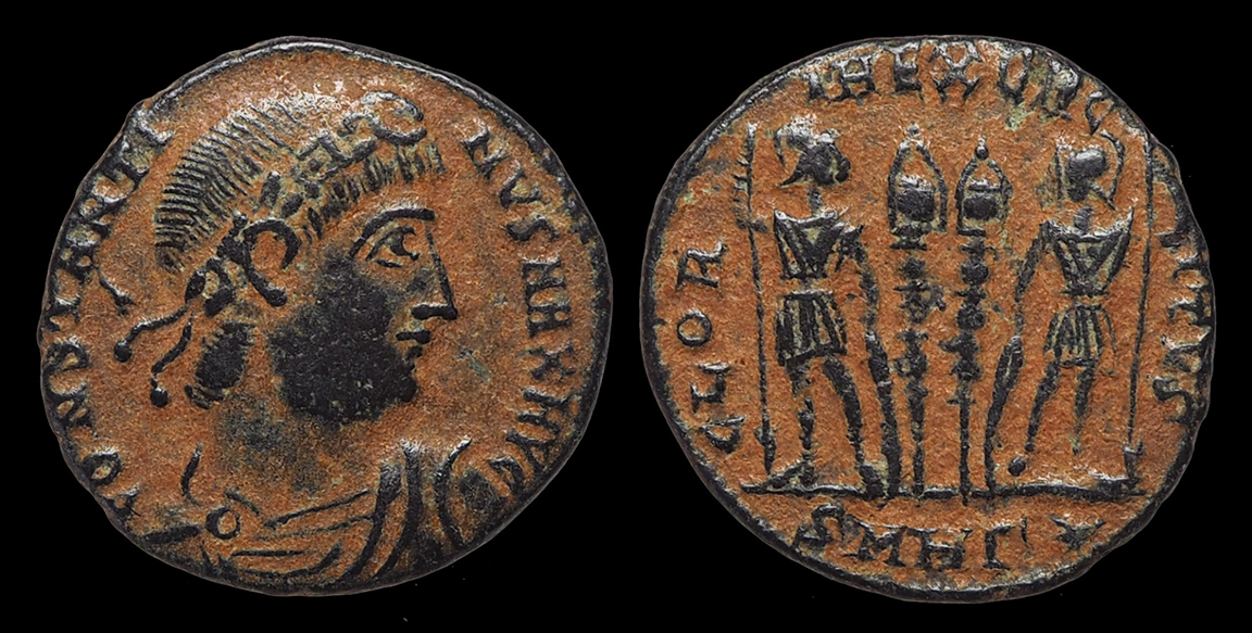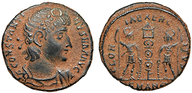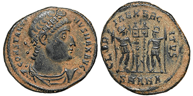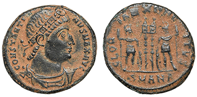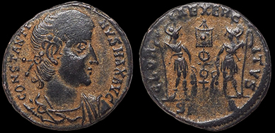 Constantine I the Great. Bronze coin. His rosette-diademed, draped, cuirassed bust right, CONSTANTINVS MAX AVG / Two soldiers holding spears and shields with two military standards between them, GLORIA EXERCITVS, A-SIS = Siscia mint. 18.5 mm. Nice glossy black tone. Great detail! #15461: $99 SOLD