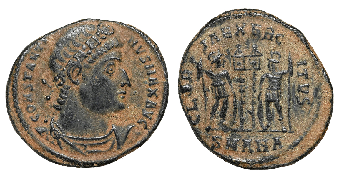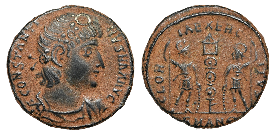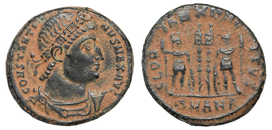 Ancient Rome. Constantine I the Great, 307-337 AD. Bronze reduced follis struck 330-335 AD. His rosette-diademed, draped, cuirassed bust right, CONSTANTINVS MAX AVG / Two soldiers holding spears and shields with one standard between them, GLORIA EXERCITVS. Mintmark: SMANA (Antioch mint). ref: RIC VII 86. 17 mm, 2.71 g. Gorgeous portrait, choice deep coppery tone. #CR2948: $125 SOLD