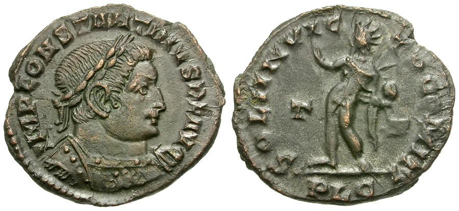 Constantine I The Great, 307-337 AD. Silvered-bronze follis struck 309-310 AD, Lyons mint. His laureate and cuirassed bust right, IMP CONSTANTINVS P AVG / Sol standing left, chlamys falling from left shoulder, holding globe and raising right hand, SOLI INVIC-TO COMITI; F-T across fields. Mintmark PLG. ref: RIC VI Lyons 308. 23 mm, 4.50 g. Great detail! Traces of silvering remain on surfaces. #CR2631: $150 SOLD