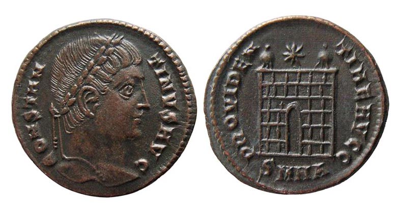 His laureate bust right, CONSTANTINVS AVG / Roman castle camp-gate with two turrets, star above, PROVIDENTIAE CAESS. SMKE below = Cyzicus mint. 18 mm dia. Excellent coin with sharp details! #9657: $75 Sold?