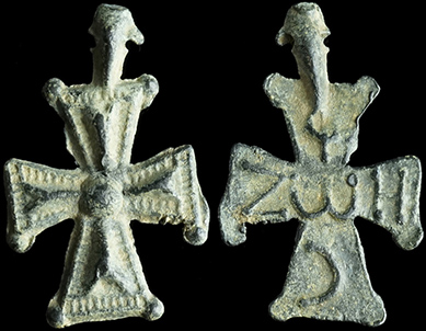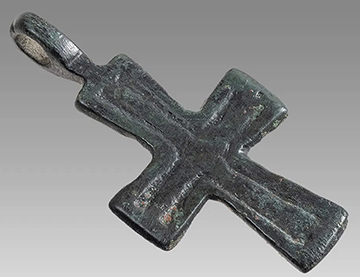 Medieval Europe, c. 9th-12th century AD. Small bronze cross pendant. Both sides decorated with a central "X". H: 25 mm (1 inch"), with dark green patina, suspension loop intact. #JM2380: $125 SOLD