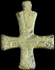 Medieval Europe, c. 8th-11th century AD. Small bronze cross engraved with a "cross-within-cross" design. Suspension loop lost in antiquity. Brassy/olive-green patina. H: 31 mm