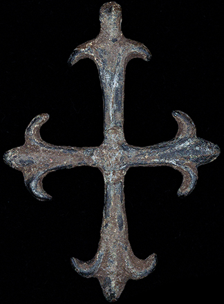 Medieval Europe, c. 6th-8th century AD. Bronze cross pendant. Decorated with punched-dot "Five Wounds of Christ" design and ornate terminals. Olive-green patina with earthen deposits. 40 mm