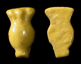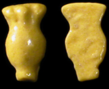 Ancient Egypt. Late Dynastic Period, c. 664 - 30 BC. A rare yellow faience amulet of a sistrum, either side with face of the goddess Hathor in relief. H: 20mm, holed through at top for suspension. Ex Boston Museum of Fine Arts; previously in the collection of Horace L. Mayer who loaned and gifted items to the museum throughout the 1930's-60's. After his passing much of his remaining collection was gifted to the museum. #AE2837: $250 SOLD