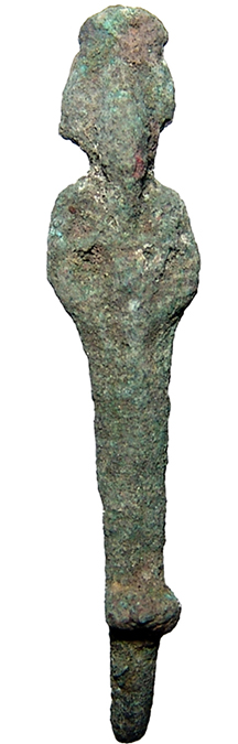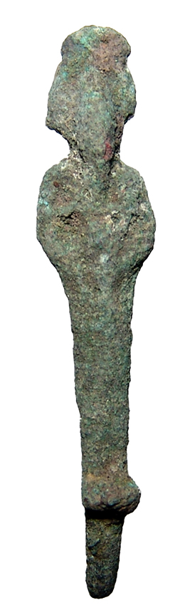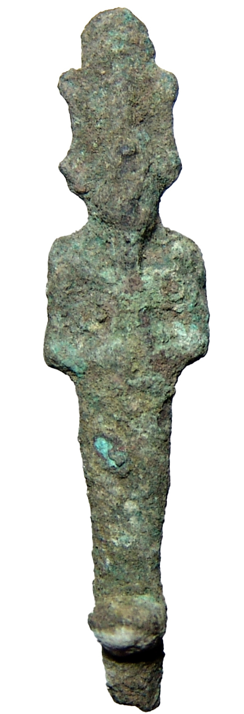 Ancient Egypt, Late Dynastic Period, c. 664 – 332 BC. Small Egyptian bronze figure of Osiris. Depicted mummiform, wearing atef crown with uraeus and false beard, arms folded across chest, clutching a crook and flail. Short tang at base for attachment to a base or placement in a niche. 66 mm (2 5/8"). Green patina with heavy earthen deposits. Ex New Jersey estate. #AE3363: $150 SOLD