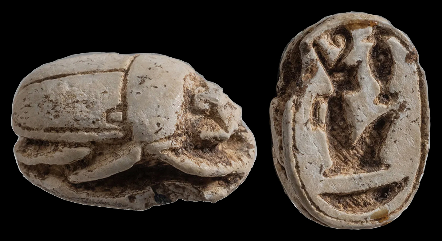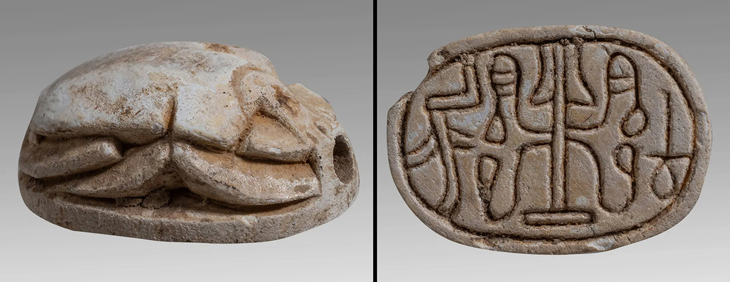 New Kingdom, 1570-1070 BC. Steatite scarab, engraved with Isis wearing plumed headdress. L: 13 mm. Repaired, with chipped edges, but beautiful style! Ex New York collection. #AE2637: $399 SOLD