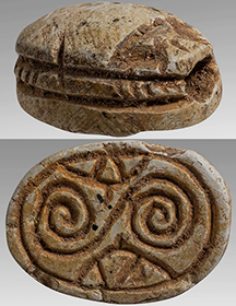 Ancient Egypt, New Kingdom, c. 1570-1070 BC. A neat small carved steatite scaraboid seal decorated on the top with a depiction of a tilapia fish! L: 10mm, holed-through for suspension. Ex Private UK collection, acquired in the 1960's-1980's; ex Helios Gallery, UK. #AE3301: $250 SOLD