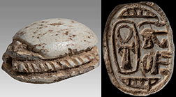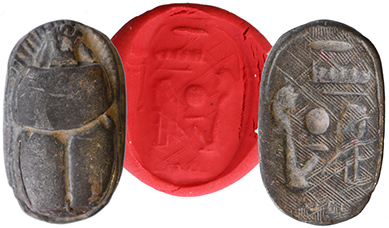 Third Intermediate Period, c. 1570-747 BC. Steatite scarab. The base with symbols that in themselves don't say anything but overall represent luck and protection. L: 16mm. Ex Malter galleries, Encino, CA. #AE3261: $450 SOLD